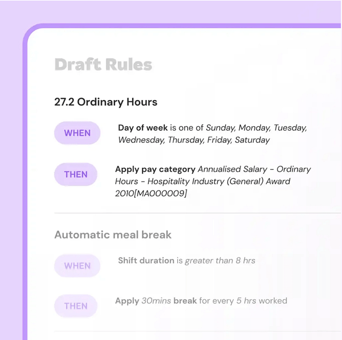 Like shift allowances that kick in at certain times, overtime calculations that vary based on how many hours someone has worked in a week, or different rates for weekends versus public holidays. All of these can be automated with rules.